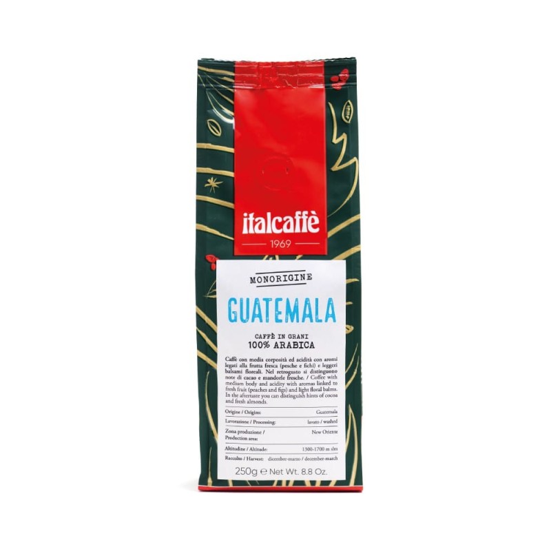 La zona di produzione è contraddistinta da piccoli terreni coltivati da piccoli produttori. Si tratta di un caffè amabile, molto equilibrato con media acidità e corposità. Si distinguono sentori di malto, cacao e cereali. Note di cioccolato e noccioline tostate nel retrogusto. L’area vulcanica, le frequenti precipitazioni e la particolare umidità danno vita ad un caffè molto bilanciato. Un caffè squisito, da veri intenditori. Caffè Arabica Italcaffè selezionato del Guatemala per un offrire un Espresso di altissima qualità. È disponibile in sacchetto da 250g in grani confezionato in atmosfera protettiva, saldato sui quattro lati e con valvola salvaroma unidirezionale. ATTENZIONE: Per un ordine di 6 kg di caffè in grani Guatemala Vi offriamo in omaggio 1 Tazza di caffè o da cappuccino a marchio Italcaffè in porcellana per Bar di alta qualità. Consegna gratuita con un ordine di 6 Kg di caffè.